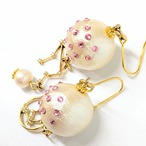 やわらかな光沢をもつコットンパールに、淡いピンクのスワロフスキーをひと粒ずつ散りばめた、星降る夜を映した一点物ピアスです。